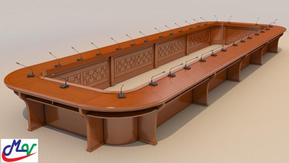 Bàn họp làm bằng gỗ verneer, chân bàn hộp dày 60mm, mặt bàn dày 70mm có chỉ trang trí,Yếm bàn có họa tiết cắt CNC tạo điểm nhấn và nổi bật của bàn họp. Kích thước bàn: W7000xD2500xH760mm