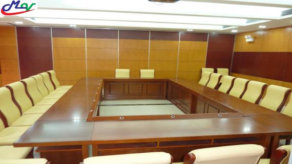 Bàn họp làm bằng gỗ verneer. Kích thước: W4500xD2200xH760. Mặt bàn dày 60mm chân bàn dày 50mm, trên mặt bàn tạo gờ nổi trong đó khét lỗ chạy micro. Yếm bàn được trang trí phào nổi tự nhiên tạo điểm nhấn cho bàn. Bàn rỗng giữa rộng 1000mm, bàn có đợt để tài liệu.