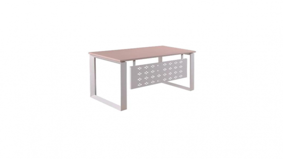 Bàn làm việc chân sắt tam giác sơn tĩnh điện, mặt bàn gỗ công nghiệp melamine, yếm bàn bằng sắt sơn tĩnh điện, trên mặt bàn khoan lỗ dây điện có nắp nhựa.