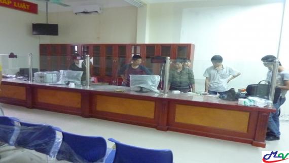 Bàn quầy một cửa hành chính công làm bằng gỗ verneer, Yếm bàn trang trí ghép vân, trên mặt bàn có các cọc kính inox và kính cường lực có khoét lỗ để giao dịch. Kích thước theo thiết kế