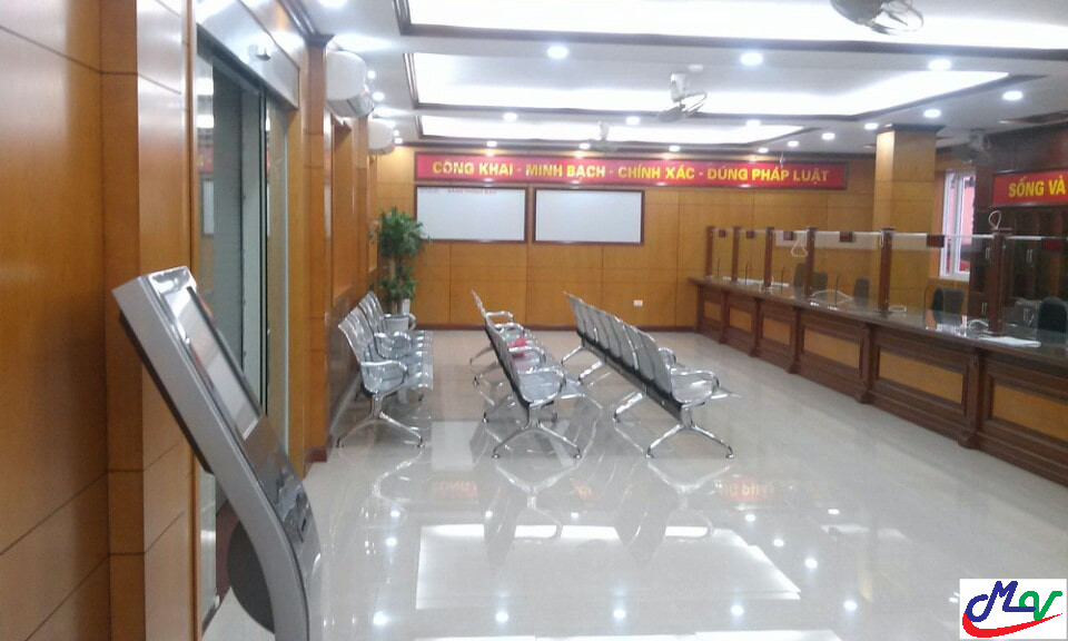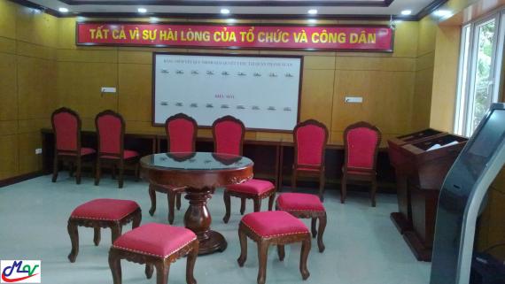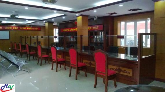 Bàn quầy một cửa hành chính công làm bằng gỗ verneer. Kích thước theo thiết kế. Bàn được kết hợp gỗ tự nhiên cao cấp với verneer, các cột gỗ được liên kết với tấm kính cường lực để ngăn cách giữa công dân với cán bộ giao dịch. Xung quanh phòng ốp verneer trang trí, kết hợp hiệu ứng ánh điện, tạo cho phòng giao dịch hành chính công thêm sang trọng và uy nghi. Lối vào sảnh chính được trang bị cửa kính tự động và cửa cuốn tạo cho khu làm việc hết sức hiện đại.