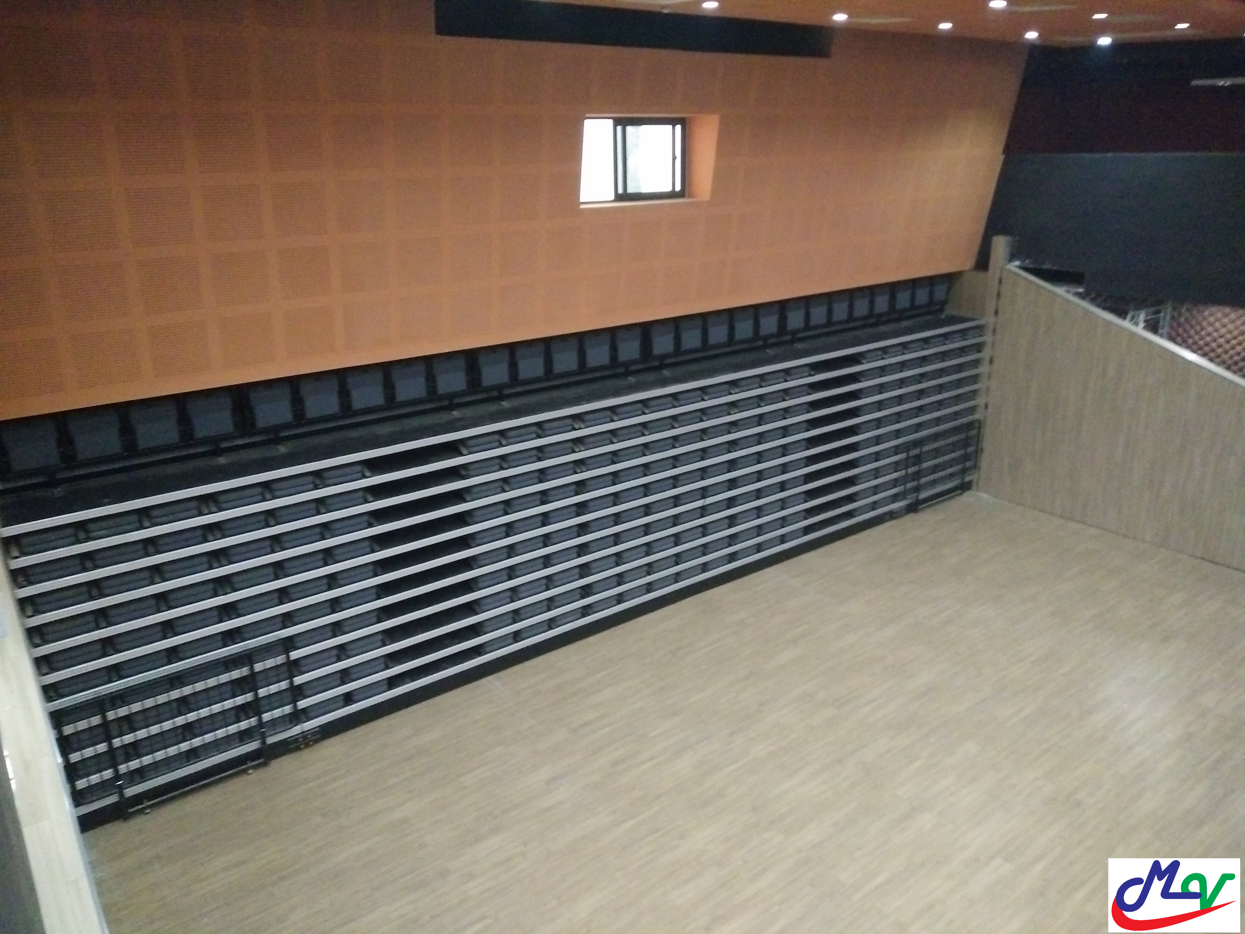 Ghế hội trường đa năng di động là loại ghế hội trường đặc chủng dùng cho các hội trường đa năng, nó có thể xếp gọn vào vị trí khi không sử dụng để tạo mặt bằng cho các môn thể thao khác.  Ghế hội trường đa năng được dùng cho các nhà thi đấu các môn thể thao kết hợp và được dùng nhiều cho các trường quay của các đài truyền hình, các trường quay di động. Ghế được sản xuất theo đơn đặt hàng và theo kích thước thực tế của từng phòng. Chất liệu của ghế hội trường đa năng là kết cấu khung sắt được sơn tĩnh điện được sản xuất trên dây chuyền hiện đại của nhà máy Hàn Quốc, bục sân khấu bằng gỗ công nghiệp có các nẹp nhôm  chạy xung quanh bục, ghế được bắt vít xuống sàn di động, tự gập xuống xếp gọn vào vị trí. Ghế di chuyển nhẹ nhàng bằng 02 dạng: Dạng 1: chạy bằng động cơ, Dạng 2: chạy bằng cơ (Tức đẩy bằng tay). Cả 02 dạng chuyển động này di chuyển nhẹ nhàng nhờ có hệ thống truyền lực và có các bánh xe bằng nhựa đúc đặc chủng chuyên dụng.