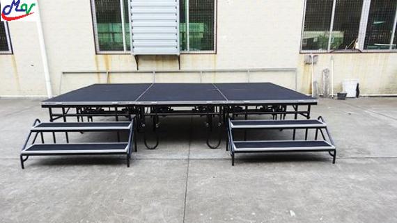 Sân khấu di động kết cấu làm bằng khung sắt sơn tĩnh điện, sàn làm bằng gỗ công nghiệp ghép các tấm vào với nhau bên trên cùng trải thảm đỏ hoặc màu sắc tự chọn, có bánh xe có thể di chuyển dễ dàng, dễ tháo lắp cất gọn vào vị trí. Khung chân làm bằng ống thép các loại □32×12; Ø25,4; □30×30; □20×20 sơn bột tĩnh điện, được thiết kế với cơ cấu gấp. Chiều cao của sân khấu có thể giao động từ 400mm đến gần 2000mm. Trọng tải của sàn là 600kg/1m2.