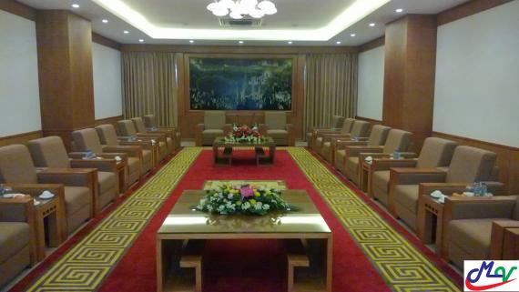 Kích thước của sofa KT04: W900xD870xH950. Sự kết hợp hài hòa giữa sofa khánh tiết, thảm trải nên hoa văn, Tấm phù điêu trang trí ở giữa tạo điểm nhấn vô cùng trang trọng và sự kết hợp giữa trần chìm thạch cao, đèn chùm cùng với ốp verneer trang trí xung quanh tường càng tôn thêm vẻ đẹp của ghế Sofa khánh tiết Kt04.