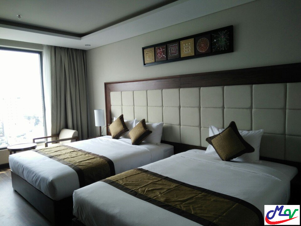 Thiết kế nội thất khách sạn bao gồm giường ngủ, táp đầu giường, chăn ga gối đêm, rèm che nắng, ánh sáng bố trí làm sao cho phù hợp với không gian và nhu cầu của người dùng, Trần thạch cao giật cấp, ván sàn gỗ vv..