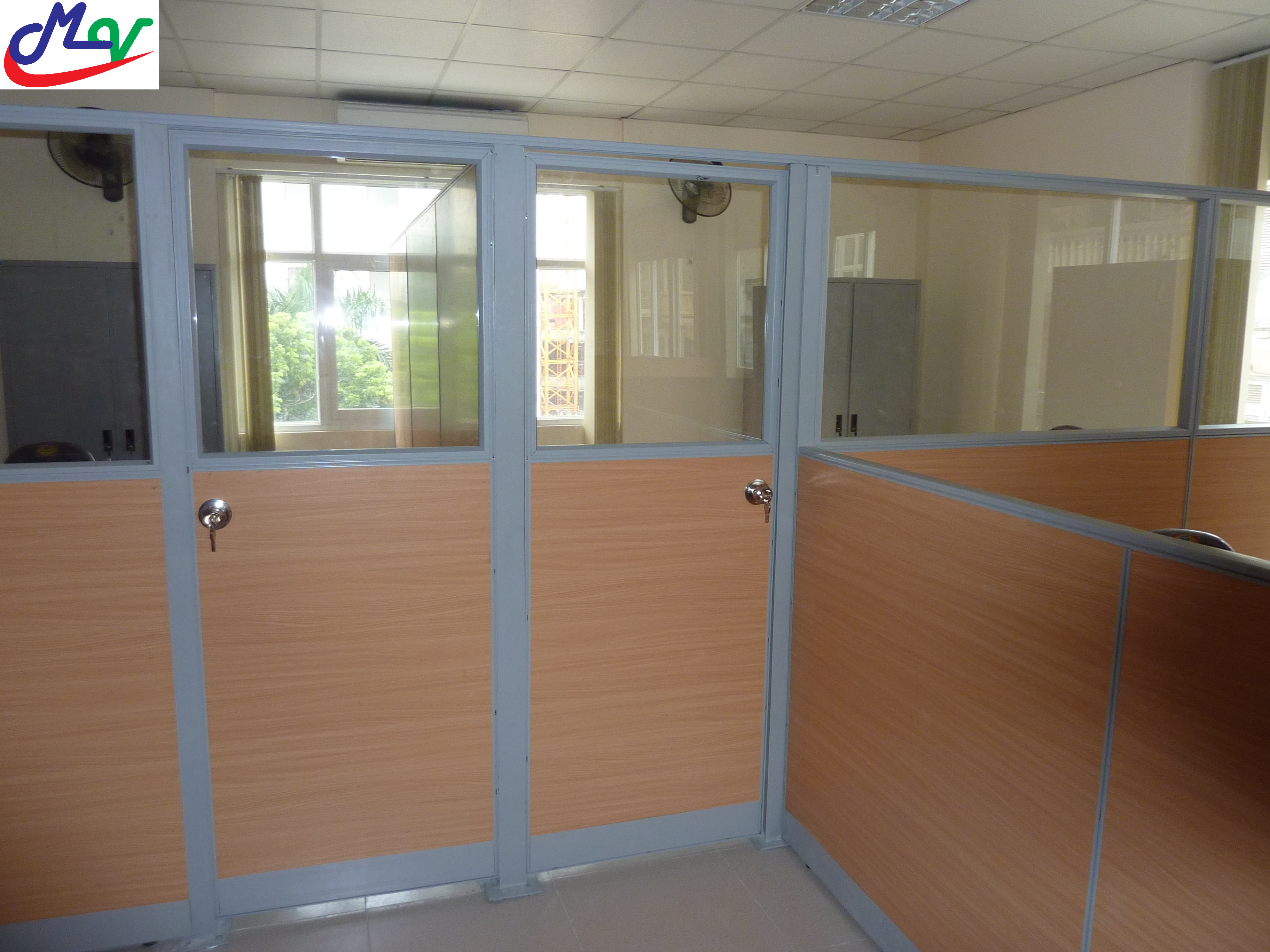 Vách ngăn khung nhôm bọc gỗ, được làm bằng khung nhôm định hình chuyên dụng  bọc gỗ MDF phủ melamine, có thể làm vách kết hợp với kính, chiều cao của kính thường cao 250mm hoặc 300mm kính dày 5ly. Vách có chân tăng chỉnh độ cao, có hộp kỹ thuật để đi dây điện thoai, dây mạng, dây điện rất tiện ích và gọn gàng.