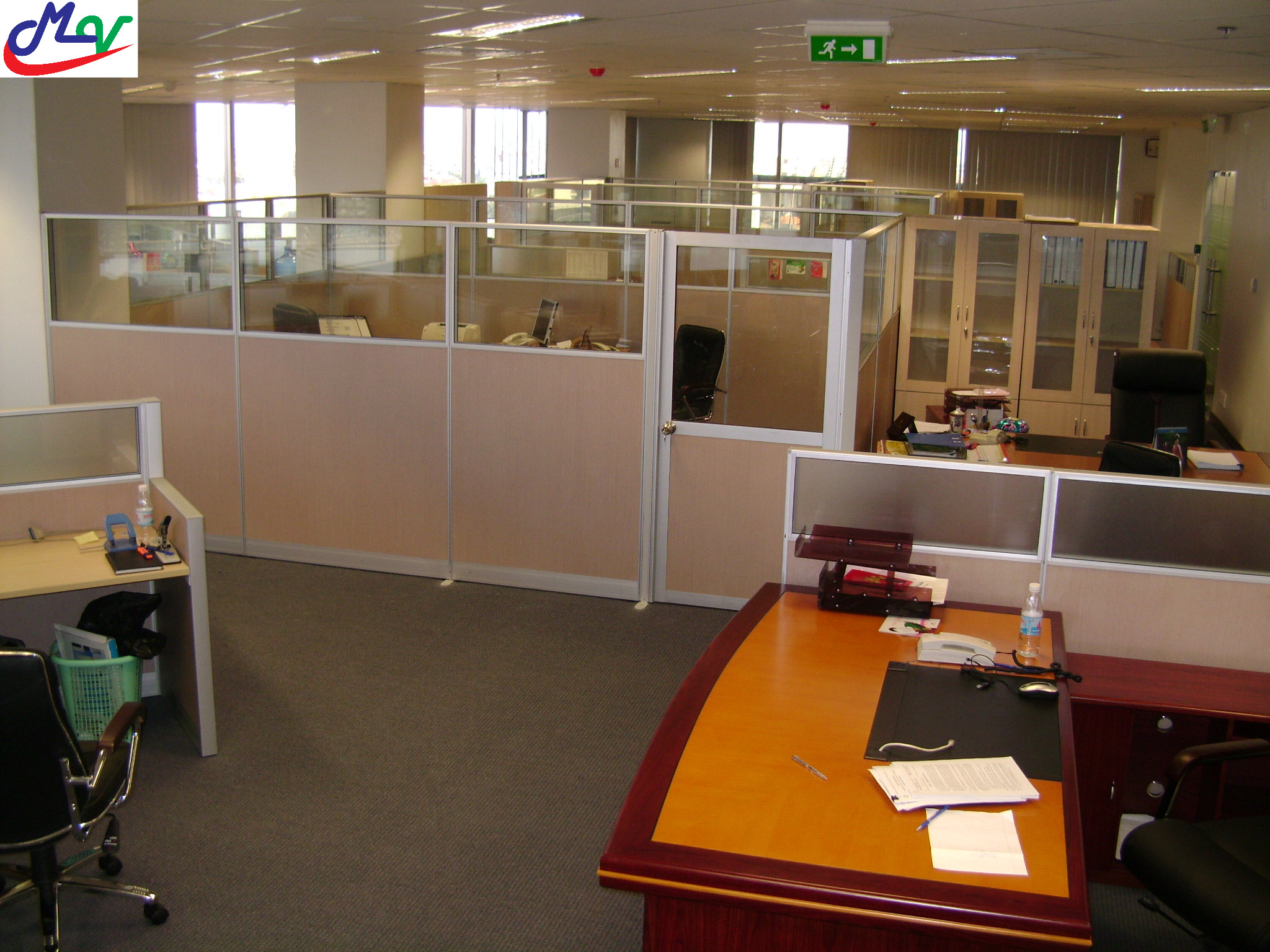 Vách ngăn khung nhôm bọc gỗ, được làm bằng khung nhôm định hình chuyên dụng bọc gỗ MDF phủ melamine, có thể làm vách kết hợp với kính, chiều cao của kính thường cao 250mm hoặc 300mm kính dày 5ly. Vách có chân tăng chỉnh độ cao, có hộp kỹ thuật để đi dây điện thoai, dây mạng, dây điện rất tiện ích và gọn gàng. Vách có độ dày 58mm và 38mm